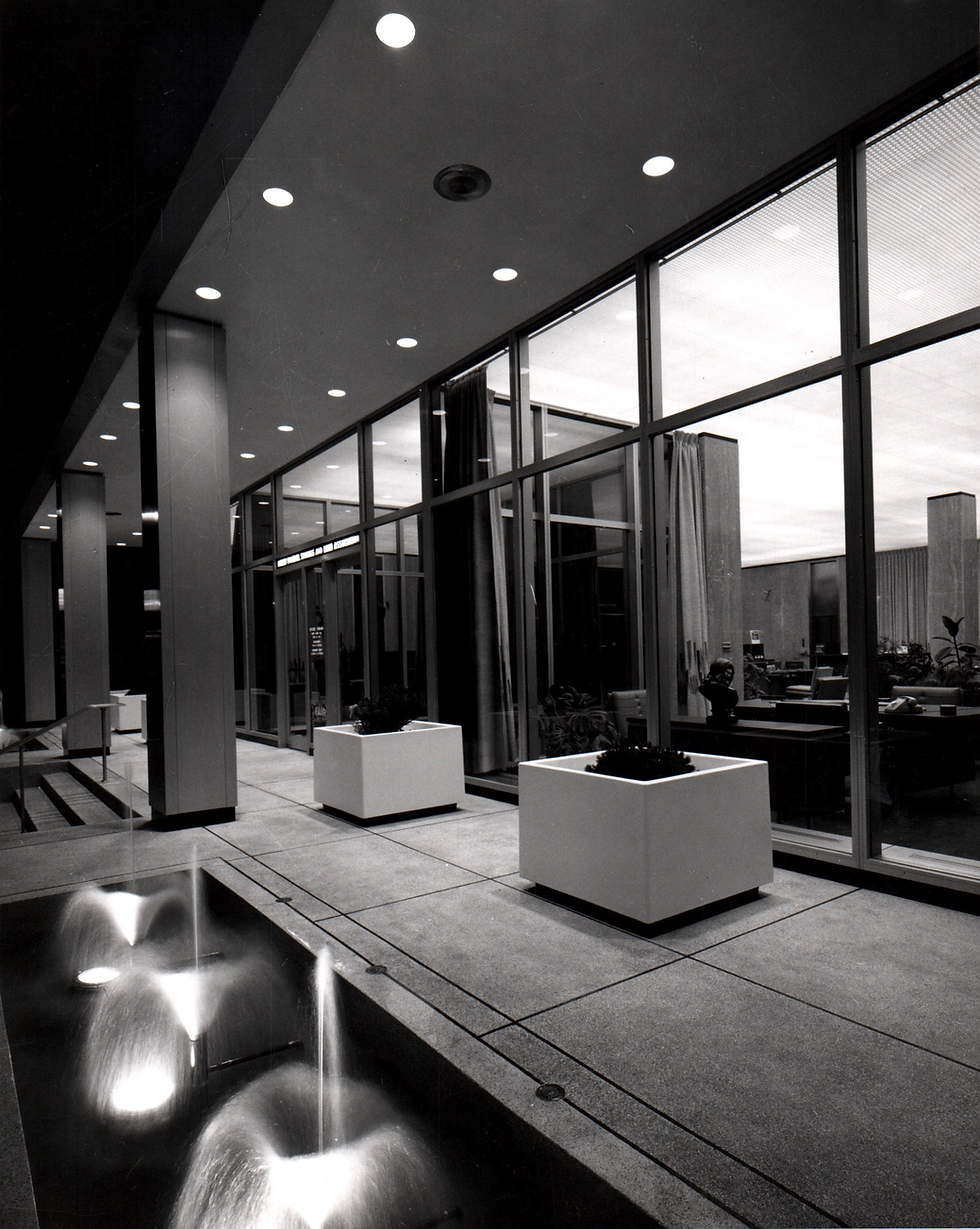 The use of a glass curtain wall was a defining feature of this era and signaled modernity and progress. In buildings like this, the exterior skin is non-structural, wrapping around a steel frame and allowing for expansive glazing. This approach created a sense of openness and efficiency, qualities that were especially appealing to financial institutions of the time. Vertical lines further emphasize height, giving the building a stronger presence within the skyline despite its modest scale.